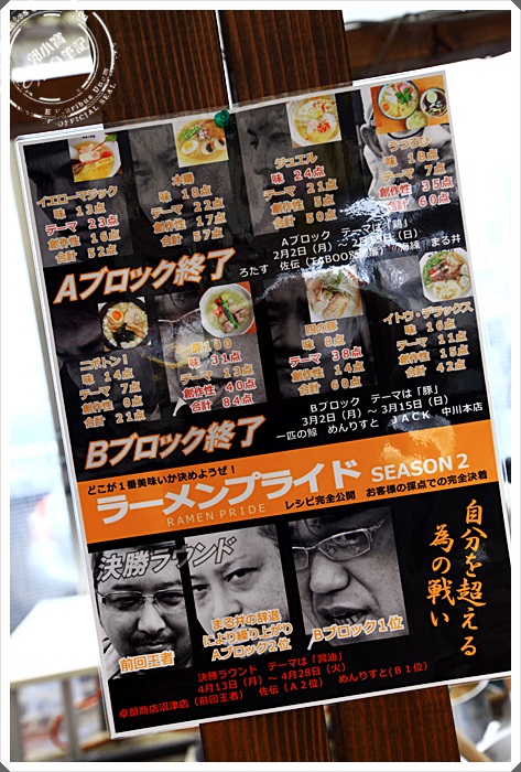 | 雖然是短期的特別銷售,但是幾乎都是各名店的老闆都親自到場了,為期一個月但是因為人潮太多還有空間有限,所以一星期是輪七家拉麵店,重點是還有再算人氣度,會結算各家售出的銷售量來奠定各家拉麵在靜岡縣的霸主地位。 |