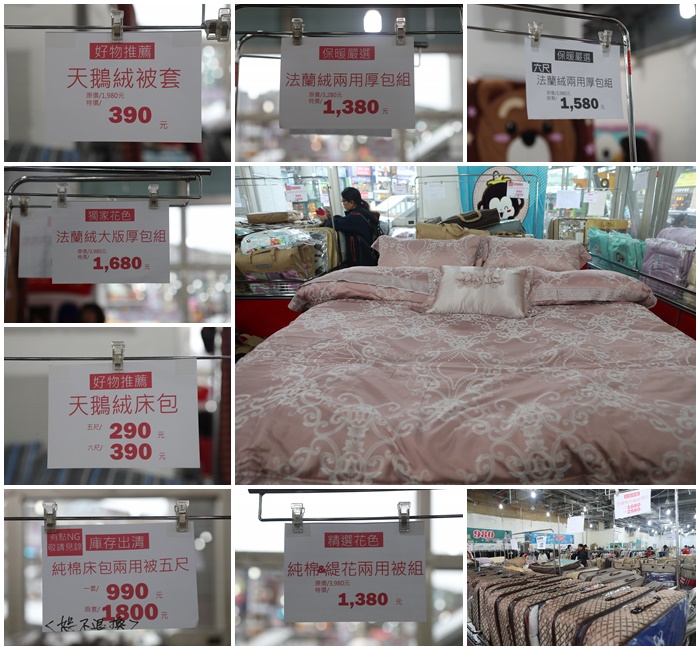 | 看看這一堆專區的標價牌就知道,真的有夠便宜了,有想入手寢具的朋友可以先上網查價大約落在哪個價位,如果有興趣真的趕快到現場挑選,這次只有短短的10天左右特賣,都是特價快閃! |