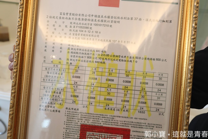 | 最重要的來了,這邊可是溫泉水,還經過新北市政府認證過的,富裔河還簽下了水權,證明這個溫泉水可不是隨便挖挖就說他是溫泉水了,使用的權利也是有付費新北市政府的,溫泉水源是跟新店烏來同樣的碳酸氫鈉泉美人湯。 |
