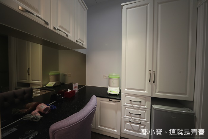 | 長櫃上方有奶瓶消毒器,因為我聽我朋友說月子中心小房雖然看起來乾淨舒適,但是真的要入住的話很多東西真的沒處塞,因為畢竟要住長達一個月,很多東西都要拿過來,產後要吃的滴雞精跟營養品、大大小小奶瓶罐,還有送餐來一整盤的餐盒,手錶皮包等等一堆雜物真的都不知道放哪,有了長櫃真的會方便很多。 |