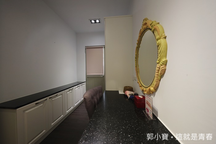 | 一旁的長型空間我很喜歡,這空間跟主臥室是牆面阻隔起來,對我來說非常方便,因為這桌面高度我剛好可以在這邊打電腦工作,還有後面的長櫃可以放置很多東西,最後面的門是通往陽台的門。 |