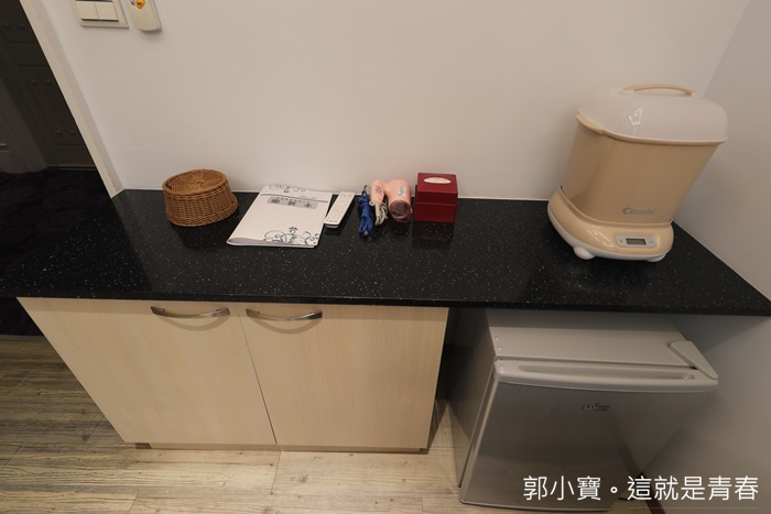 | 通往盥洗室的轉角有桌子跟衣櫃、電冰箱,雜物櫃等,每個房間都有配備奶瓶消毒器,桌面的使用空間算滿大的,對於我電腦一直離不開身邊的我非常實用。 |