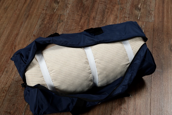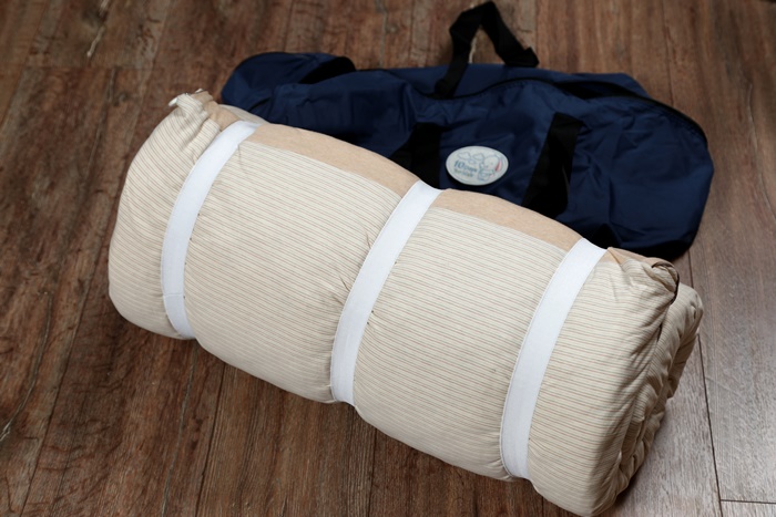 | 床墊收合的時候也有方向性的,需要把有凹槽的那一面往裡面卷才可以盡量避免床墊的彈性,然後用鬆緊帶束起就可以了,收存的方式很簡單方便。 |