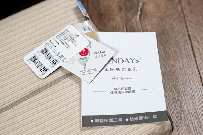 | 枕頭還附了一個防塵套非常貼心以外,TENDAYS KIDS最讓人想入手的其中一個原因就是MIT,台灣生產製造讓我更有信心,而且商品又敢掛保證,床墊保固二年、枕頭保固一年,內材是使用B.M.F高透氣減壓棉,據說生產工法相當複雜,將聚氨酯氣泡恐渡加大讓透氣性跟排水性大大提高以外,同時還能保有減壓跟舒適的功能,且具備可溫水洗滌提高透氣、速乾、低回彈等特性,針對嬰幼兒比較常會把床枕弄髒清潔時的便利性真的好棒棒! |