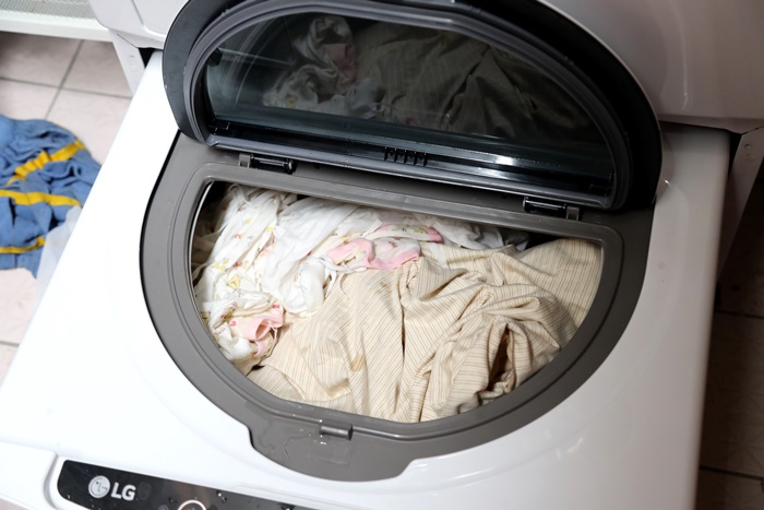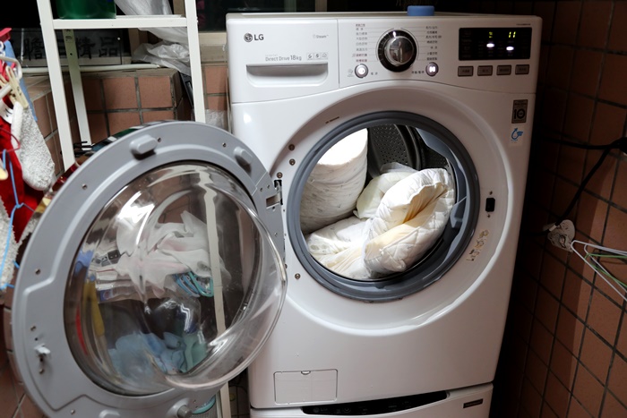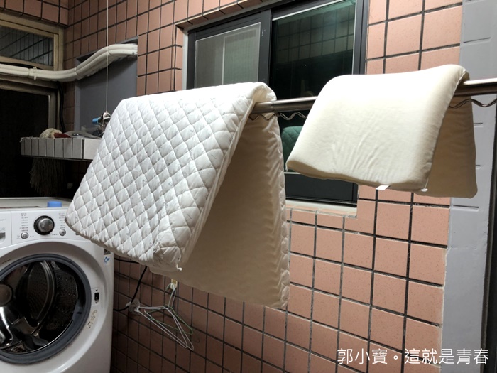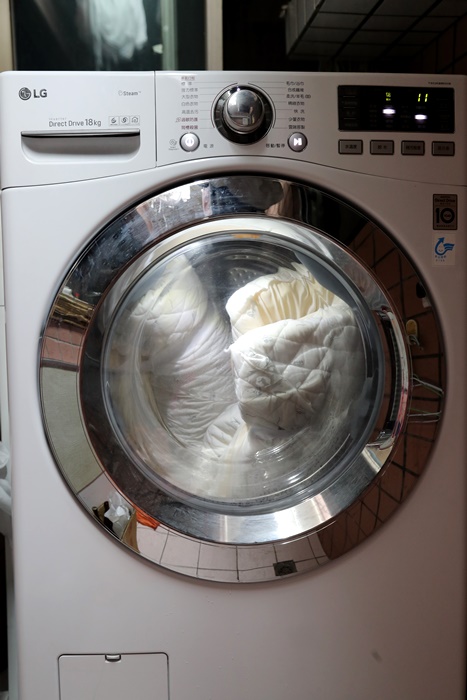 | 床墊套跟枕頭套我跟Cola的衣物一併放到下層的洗衣機使用寶寶衣物清潔劑一起洗滌,其實這樣一次處理不會很累,我覺得還滿輕鬆的,主要頭枕跟床墊的部分水洗只需要按壓就滿輕鬆的。 |