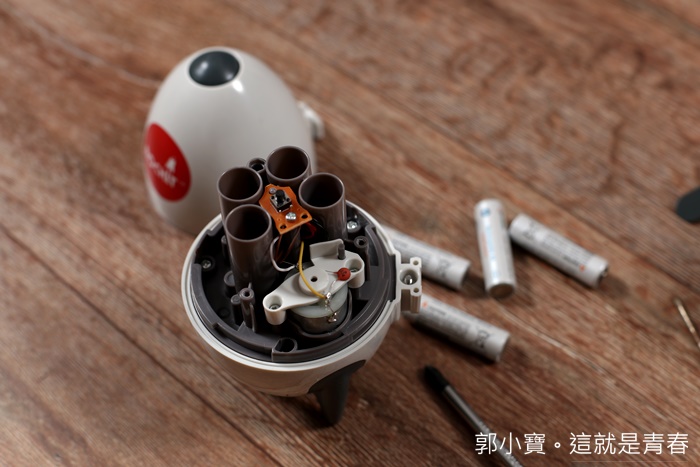 | 打開火箭的外蓋只需要側邊旋轉即可,但是要打開電池蓋就需要螺絲起子了,畢竟安撫火箭會持續晃動,所以有螺絲會比較安全。建議可以使用充電式的電池,因為寶寶做嬰兒車的時間還滿久的,一直換電池也滿傷的,所以我個人是裝充電電池。 |