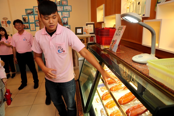 | 除了工廠跟販賣部以外,也因為全套標準化的流程讓這台灣美食更新鮮更安全,員工跟我們提醒買烏魚子的小訣竅,口訣就是真烏魚子不怕日光燈照!!! |