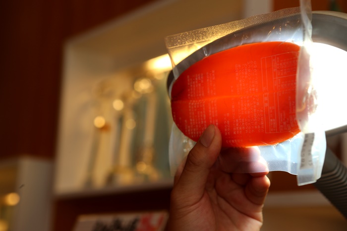 | 三代接班人小帥哥說,真的烏魚子放在白色日光燈下照會透過,即使放久了便的比較黑也會透光,加上可以透過光線看到烏魚子裡面的細微血管去判定真假。 |