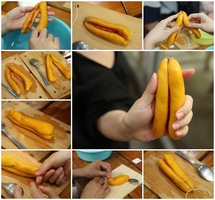 | 新鮮的烏子卵從洗血管到綁袋子抹鹽等等的手續都有專人指導教學,非常有趣有可以學習到很多,烏魚子吃了幾十年結果今天才看到新鮮的烏魚卵是如何製作成這深受喜愛的伴手禮。 |