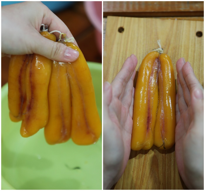 | 最後靜置15分鐘後再把醃漬好的烏魚子放入清水中洗掉鹽分,這時候就算大功告成了,但是最麻煩的還是需要風乾跟反覆的翻面這道程序最複雜,所以作到這邊工作人員就會幫你把妳的烏魚子收起來,標註上妳的姓名,後面持續的部分就讓師傅來幫你了。 |