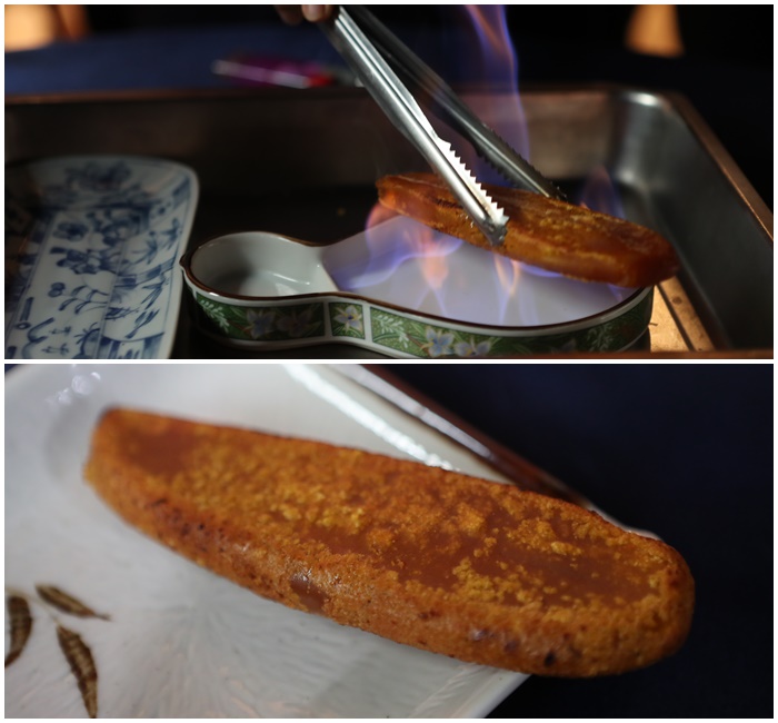 | 珍芳烏魚子大方的現烤烏魚子直接請我們品嘗,它們直接用金門高粱酒倒在瓷器的盤子裡面,點少燃燒就直接烤起烏魚子,不知道這樣烤出來有沒有酒香。 |