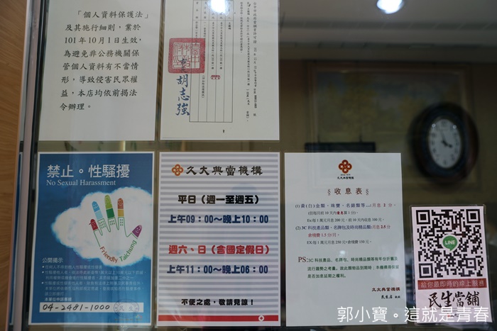 | 玻璃上貼了許多告示,除了有政府的資料還有各種合法經營的資料,所以說選擇一家信譽良好的當鋪是很重要的。 |