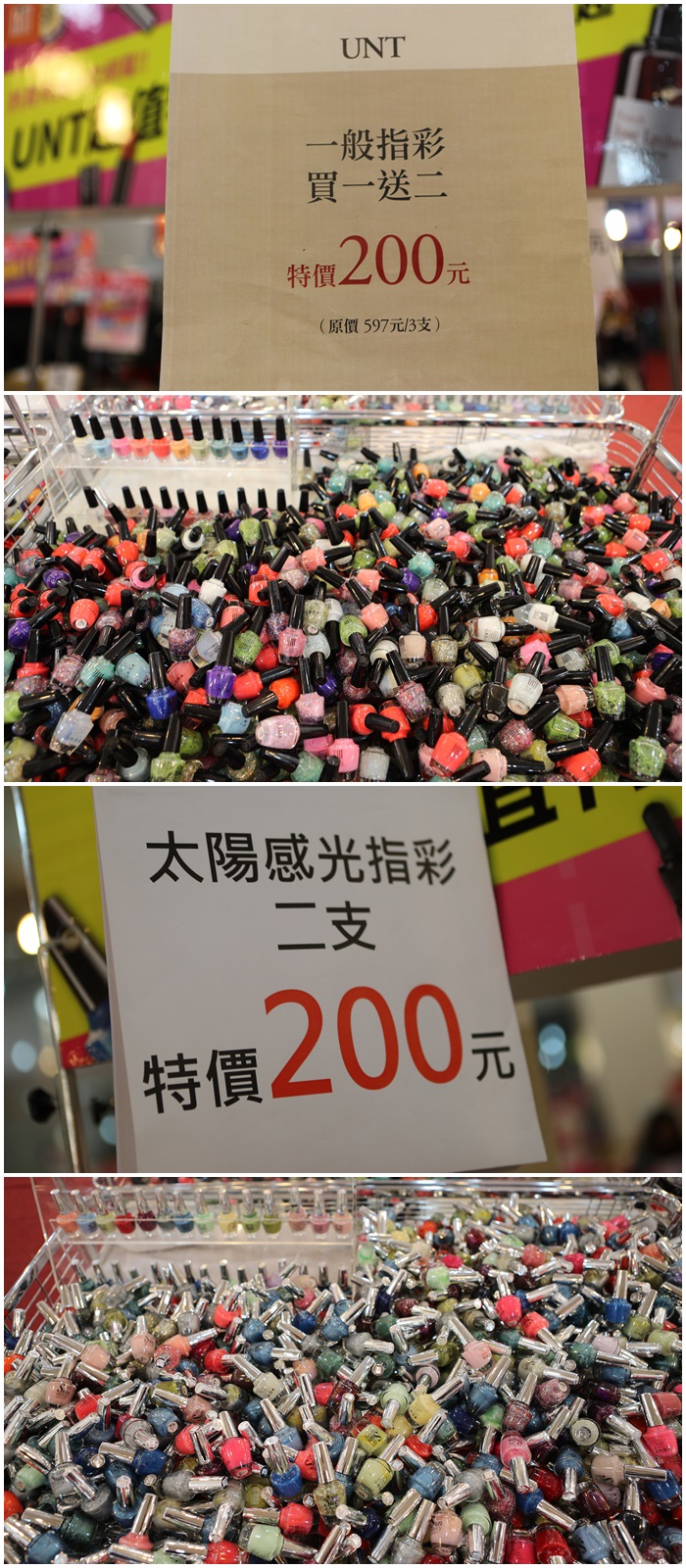 | 另一個會讓人瘋狂大採買的就是UNT的彩指,我老婆一看到特賣的價格直喊著怎樣那麼便宜,拿起小提籃就瘋狂的採購,有再買這品牌的水水們一定知道它們家的彩指真的超好用又漂亮,這次還有太陽感光彩指也超便宜的阿,這個不買真的對不起自己了! |