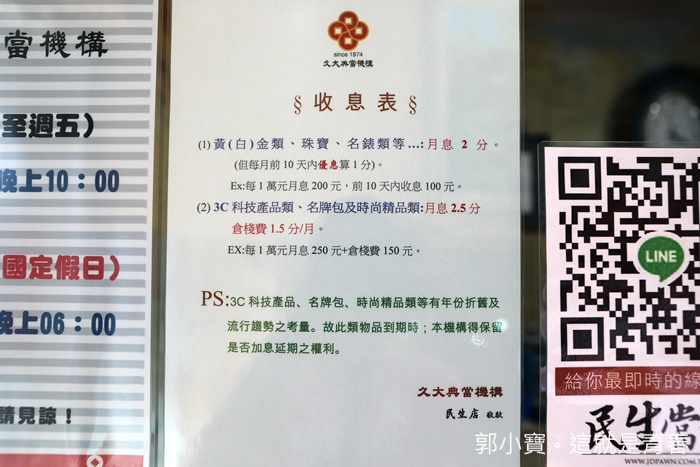 如果你真的有急需要現金周轉,也不用擔心久大的資訊不透明,直接公布一下久大御典品的月息,月息2分在國光路這一帶算是佛心月息了,佛系當鋪來著,月息2分等於一萬元利息一個月只要200,以一支勞力士錶來說如果典當20萬的話,一個月的利息就是4000元,其他的部分可以看玻璃面上面的告示,一開始就選擇清楚的告訴消費者,比信用卡循環利息上一堆小小密密麻麻的小字還要來的簡單明瞭。