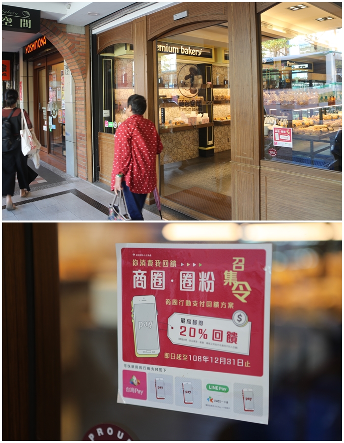 | 逛到一半的時候看到這家麵包店上面就有商圈圈粉的活動貼紙,馬上停下腳步,因為麵包也是我們家每天都會買的食物,是我們家一家三口的早餐。 |