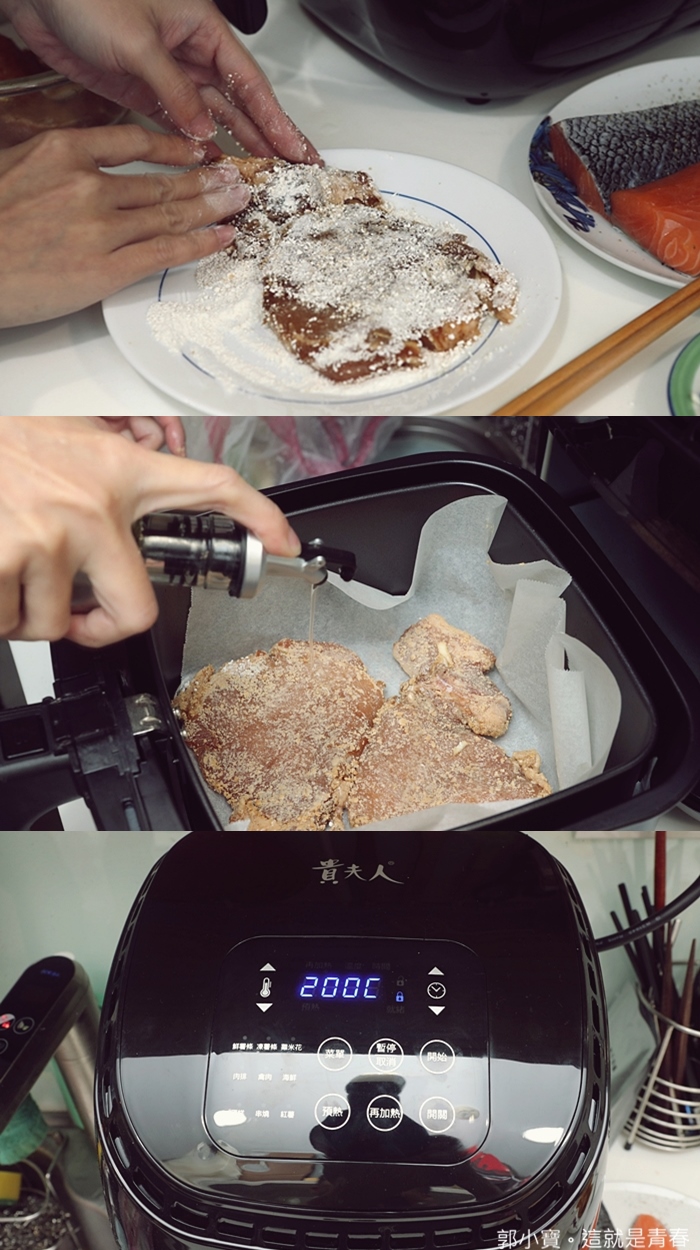| 稍微某上炸法後再噴油到器炸鍋內,如果不想事後整理清潔太費工的話,我們家都是底下會放上烘培紙最方便,設定200度15分鐘即可。 |