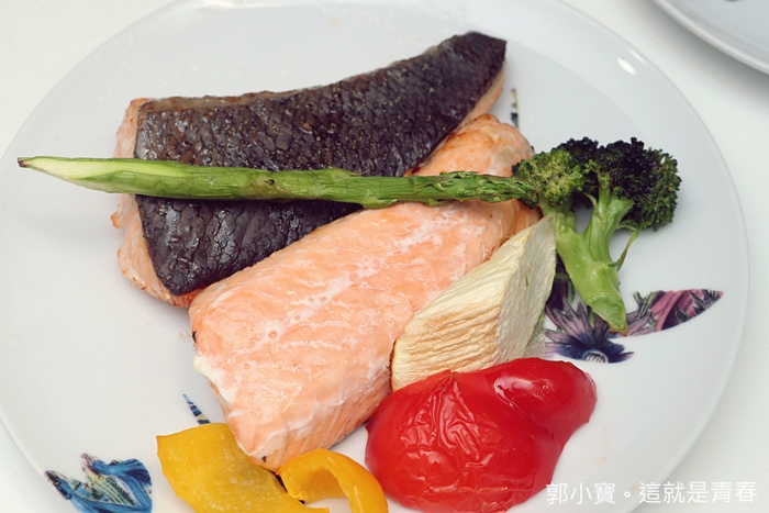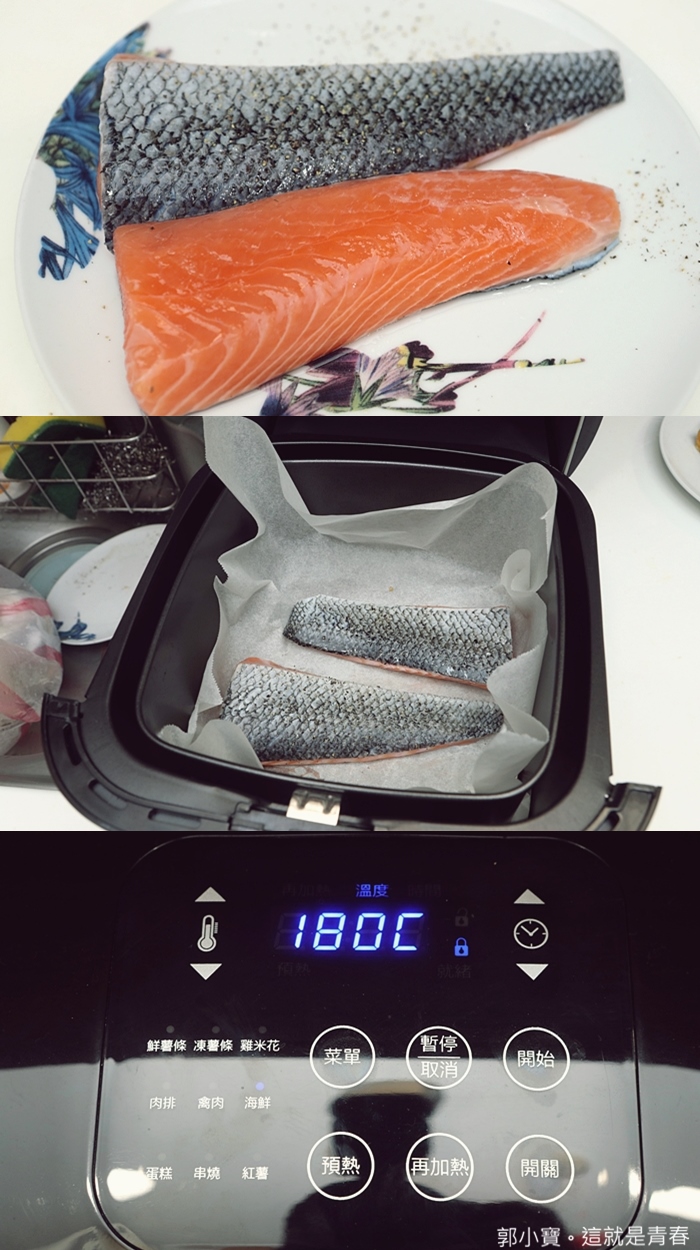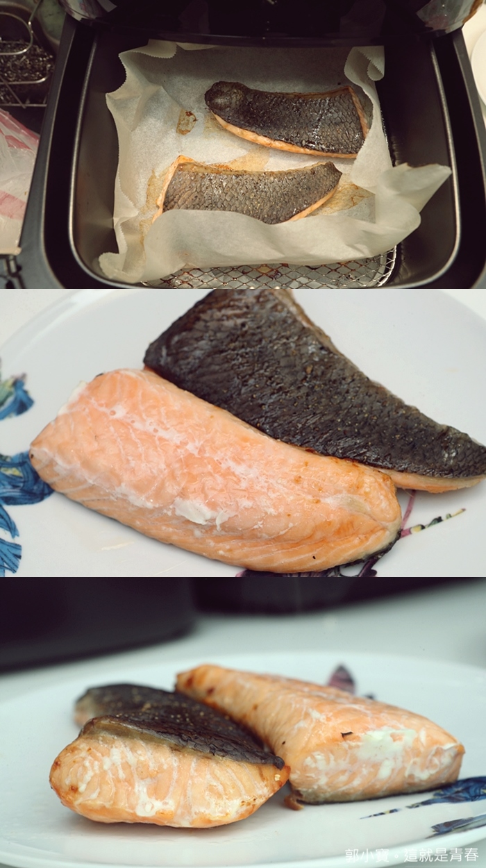 | 氣炸鮭魚排使用180度12分鐘,時間一到如果不是喜歡的熟度還可以繼續加熱,真心覺得貴夫人的氣炸鍋很強,連魚皮都可以看起來的那麼嫩口,還有厚實的鮭魚肉呈現的色澤也很美。 |