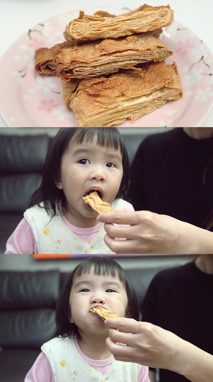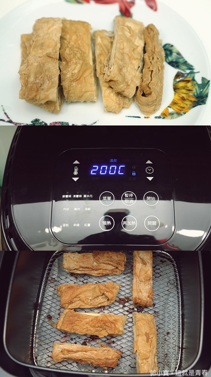 | 看看這炸豆皮的成果也超好的,調整到200度炸8分鐘即可,一口咬下的酥脆度十足以外,中間還帶一點點豆皮的豆香味,這一道最後變成我們家最常用的一道氣炸鍋料理。 |