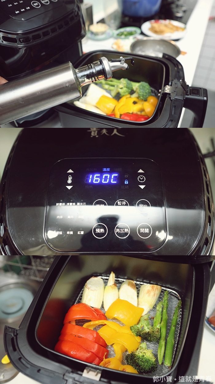 | 當然還少不了時蔬,很多人也常使用氣炸鍋來料理時蔬,時蔬卻是很容易失敗的一道,之前使用別台汽炸鍋成品幾乎都是慘不忍睹,所以這次想說貴夫人的還滿好用的,就還是來試試看時蔬的部分。 |