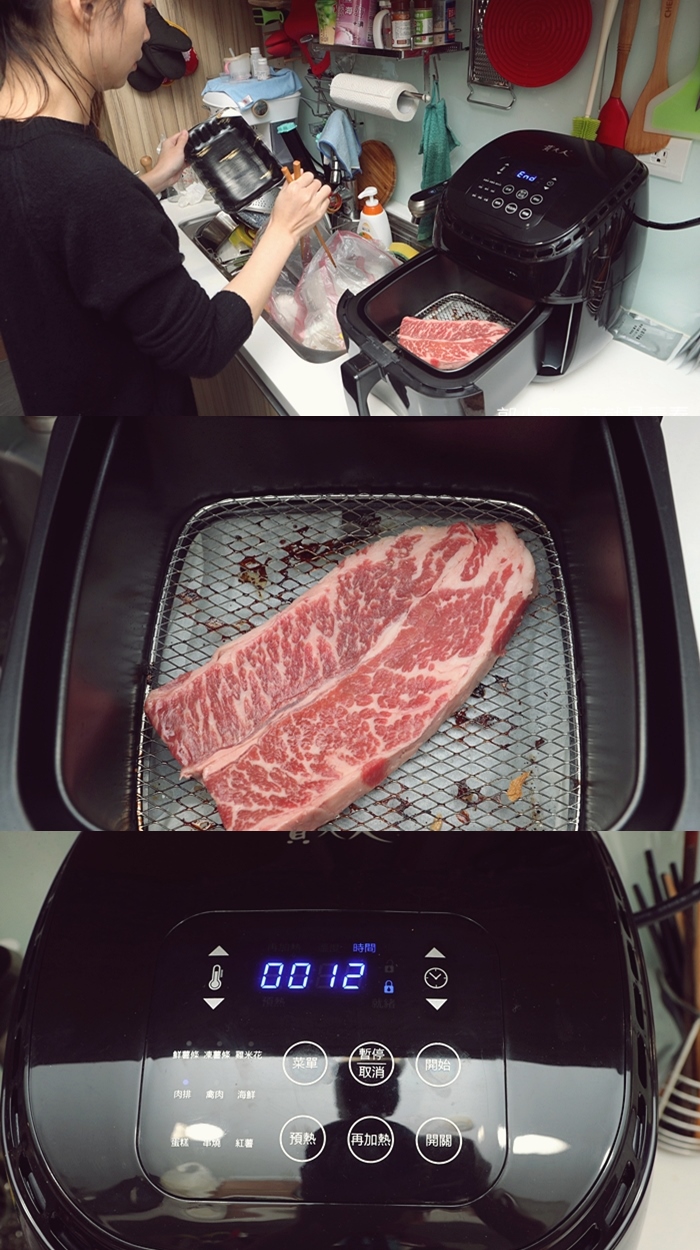 | 最後免不了要來試試看炸牛排的部分,基本上氣炸鍋炸這類還有油脂的肉品都不差,我們家因為太妃喜歡吃比較熟的牛肉,加上Cola還小的原因也不敢太讓她吃太生的肉品,所以我們是設定牛排180度12分鐘。 |