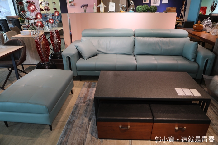 這一組水藍色的沙發真的很討喜,椅面釘扣的設計讓整體的奢華感大家分又不突兀,可調式頭枕加上U型寬扶手都很有設計感,看起來時尚大方,太妃超愛這一張沙發。 |