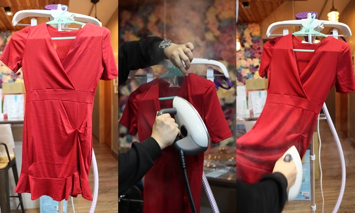 Laurasta風靡全球的主因就是獨家的「乾式蒸汽技術」,透過鍋爐加壓產生強勁的高壓蒸汽,噴射速度比一般蒸汽熨斗快15倍,同時將水分子擴散1600倍,釋放出超細緻乾式蒸汽,能快速穿透織物、撐起衣物纖維、不殘留水份,也因為這樣噴出來的是蒸汽不是傳統的水蒸氣,水蒸汽因為帶有水,在高溫下被噴到會覺得非常燙,但是純蒸汽就只會有一股熱風,當下我本來還不信,直到工作人員將方向對著自己的臉噴,當場驚嚇到我了,還真的咧!!!