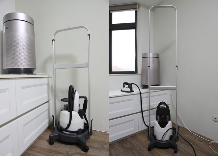 | 直接將LAURASTAR LIFT 高壓蒸汽熨斗放置於掛燙架上超方便,移動完全無障礙又輕鬆,立燙價的高度輕鬆調整,高度最高就連燙風衣都沒問題。 |