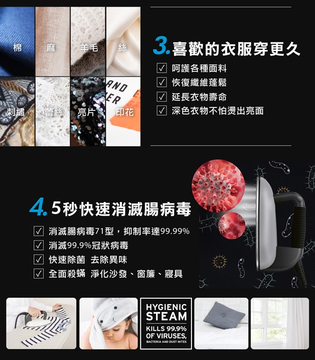 | 最吸引太妃的其中一個功能就是,高達150度的蒸汽,在燙衣同時還能殺死99.999%的細菌與100%的塵螨,確保衣服不只燙好,更能做到殺菌及淨化,雖然一般傳統的蒸汽熨斗也可以,但是加熱時間常以外又很重,而且噴出來的大多是水,會搞的想要消毒的東西都濕濕的。 |