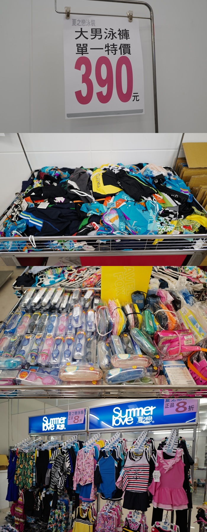 | 男泳褲通通390元,這真的超級划算,這便宜不撿真的會後悔,現場還有很多游泳的相關配備都有下殺,小朋友的泳裝也有,也可以考慮新款的泳裝,這邊只要八折就可以入手。 |