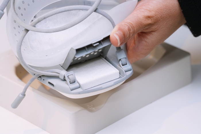 第一代一百多公克的重量已經算輕巧,第二代更是輕量設計僅有 94 克,口罩本體設計得更簡約有型。口罩正面是揚聲器。這揚聲器是為了讓 VoiceON 隱藏式語音裝置產生作用,當開啟口罩開關,內建的麥克風與喇叭會自動識別並投射聲音,讓用戶戴著口罩時,也能清楚傳遞溝通訊息,不影響防護。