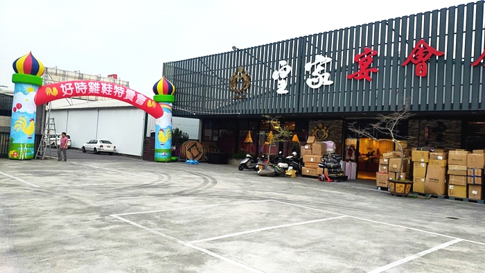 位子就在屏東縣萬丹鄉大憲街197巷17號(皇家宴會廳),店外有著大大的帆布看板,快樂龍鍋爸的五金百貨特賣會! |