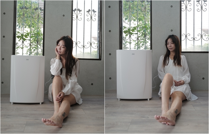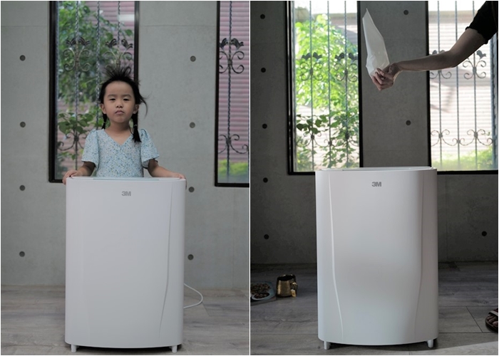 | 為了驗證3M一直強調的空氣清淨機的淨化力,更要注重 CADR(潔淨空氣輸出量)X CCM(累計淨化量)所言不假,先後拿來衛生紙跟Cola親自上場測試,即使衛生紙已經拿到離風口一段距離,衛生紙依然沒有垂落,連Cola的劉海都直挺挺的! |