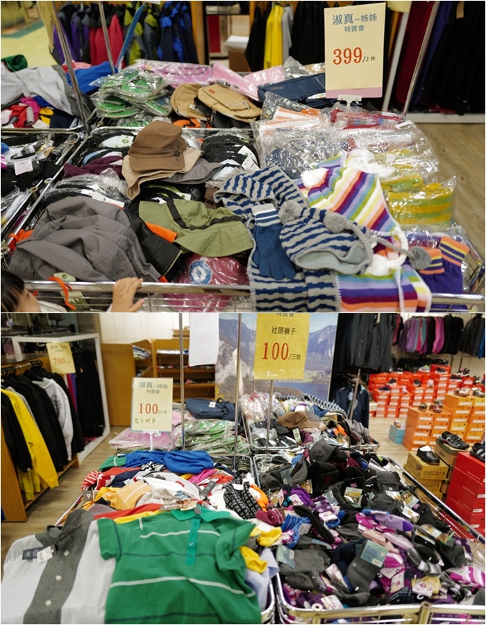 | 還以超多過季商品也通通出清特價,帽子手套三件組兩件399元也很誇張,另外旁邊的花車POLO衫通通100元,超多商品都是真真切切的出清價格。 |