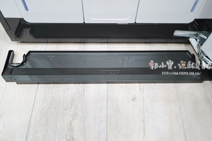 | 最下方還有一個固定架,防止地震的時候電子衣櫥的滑輪移動,看造型似乎還有集水的功能,安裝很簡單,內推扣住雙邊輪子即可。 |