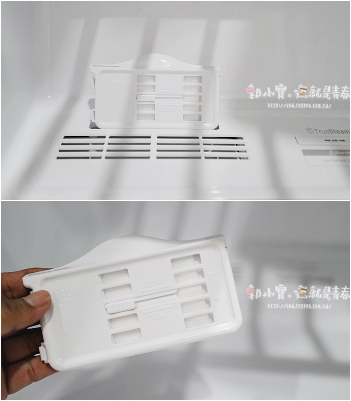 | 衣櫥最底層前端還有一個長型集塵蓋,打開集塵蓋後可以看到一層細濾網用來過濾較頭髮、毛絮及較大的異物。 |