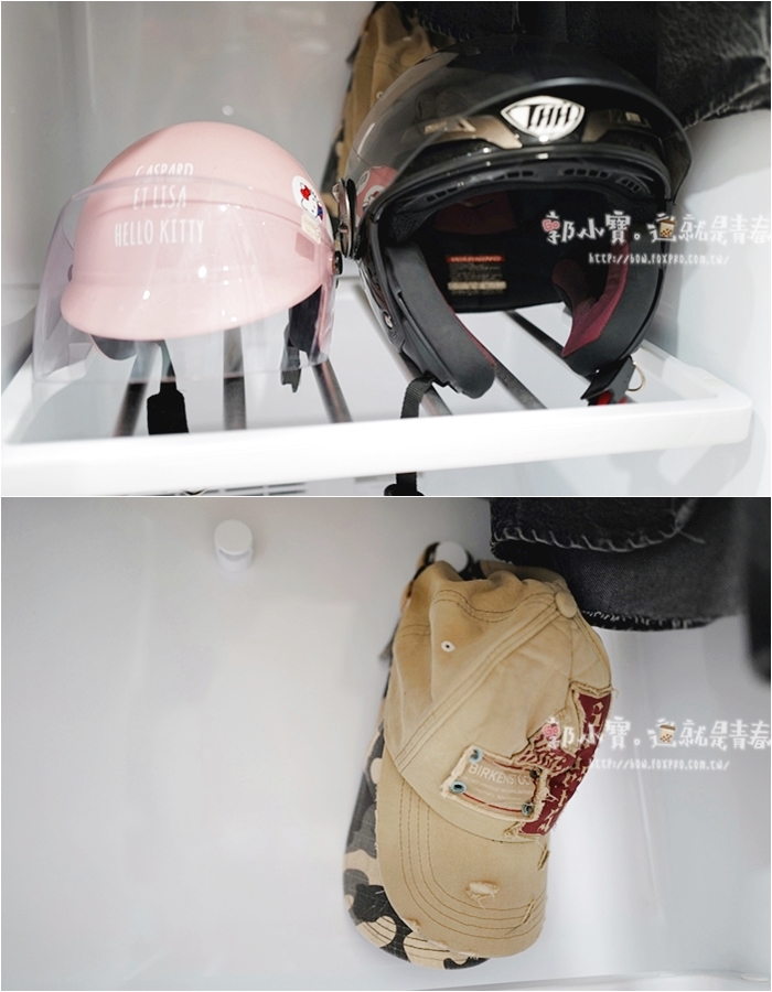 | 重點目標,安全帽真的最適合放到電子衣櫥消毒殺菌清潔,每次夏天一到安全帽是最悶熱潮濕的地方,以前我也都不知道安全帽該怎麼清潔,有了電子衣櫥瞬間得到解法,我們幾乎每個禮拜都會把安全帽放進來消毒殺菌兼乾洗,衣櫃內還有兩個掛勾,可以掛帽子類相關商品。 |
