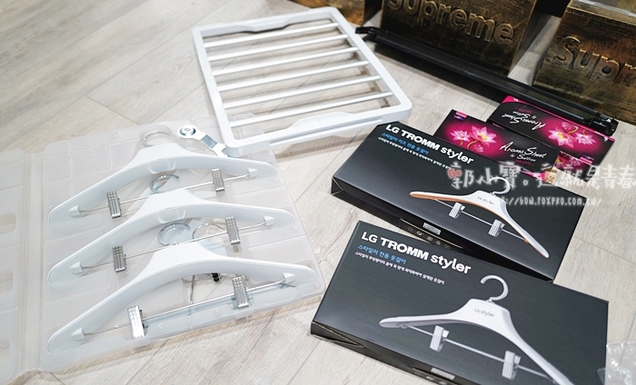 | 這次在LG桃園旗艦店入手還多送了衣架,另外還有一個兒童版的衣架,正常的蒸氣電子衣櫥PLUS五件組只有三個衣架,這還有兩大盒的LG電子衣櫥香氛片。 |
