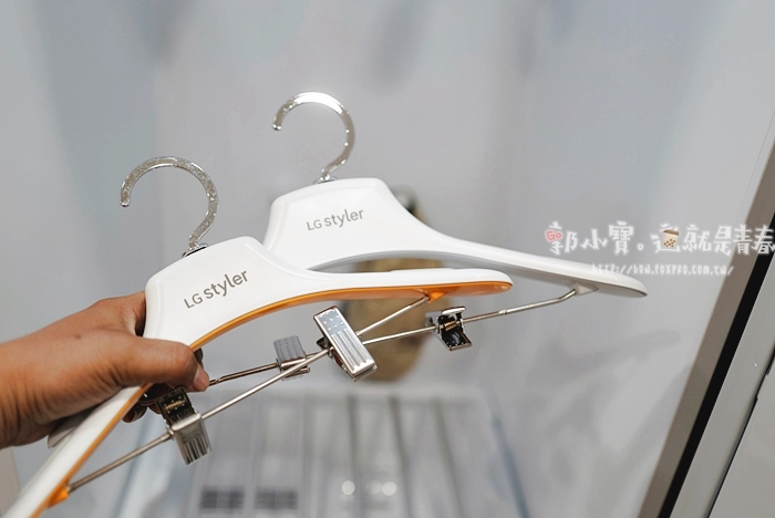 | LG電子衣櫥的衣架似乎是專用的,上面的不銹鋼較厚,掛上震盪架卡的剛剛好,兩側還有止滑墊。 |
