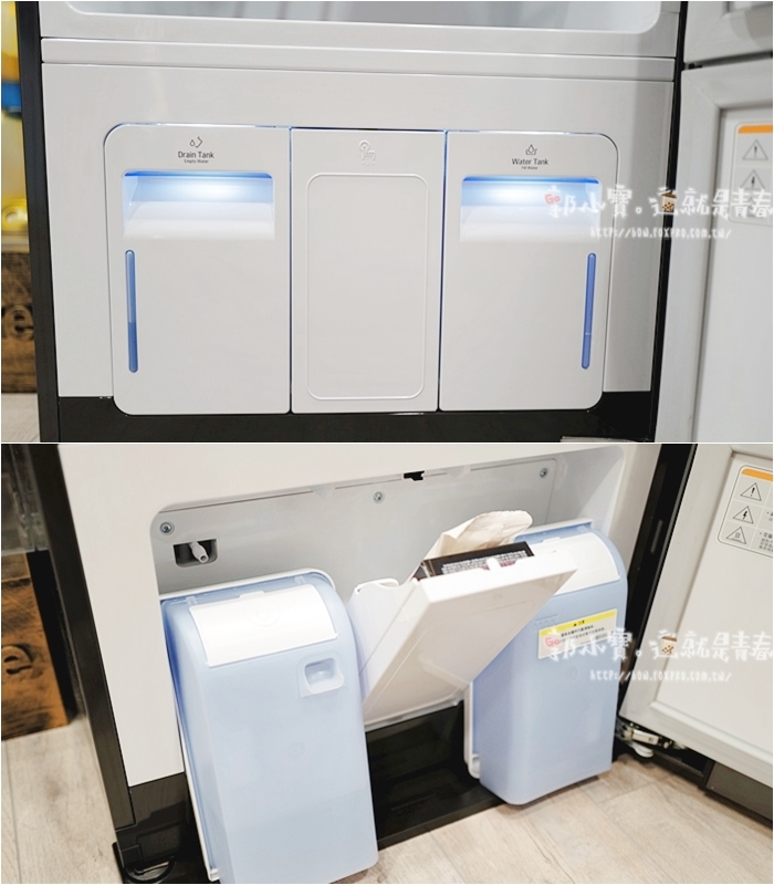 | 電子衣櫥下方有三個盒子,左邊的是排水盒,中間是放小工具的,我拿來放置香氛盒,最右邊則是加水盒(最好加純水,我都加RO水),排水盒滿的時候會有提示音,水箱的位子都有輔助燈光,可以更清楚的看清楚水箱的水位。 |