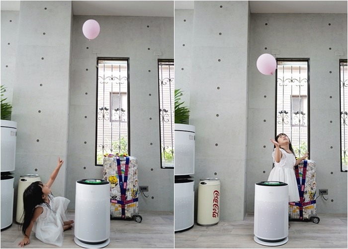 | 以前從來沒測試過,因為這次看超淨化大白空氣清淨機-Hit的出風口較特別,特別放了一顆氣球上去,氣球就這樣停留在高空中,表示氣流非常穩定,就像循環扇一樣。 |