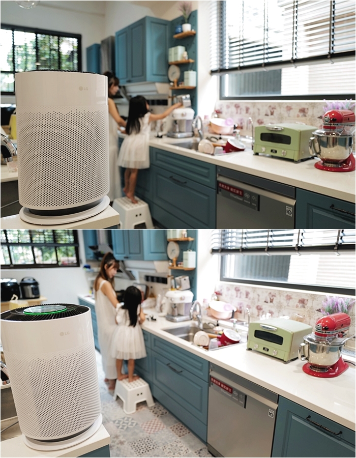 | 家裏面的廚房除了平常的炒菜煮飯以外,太妃也常常做麵粉類的材料製作,不管是烘培打麵麵粉四處飛散或是烤牛排的氣味都會吸附在廚房每個角落,超淨化大白空氣清淨機-Hit就可以有效淨化氣味。 |