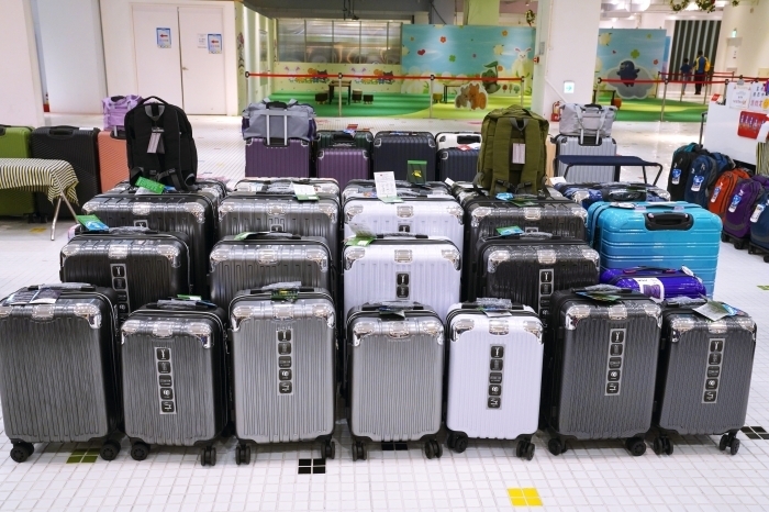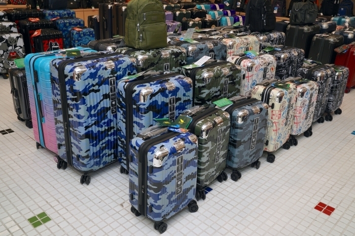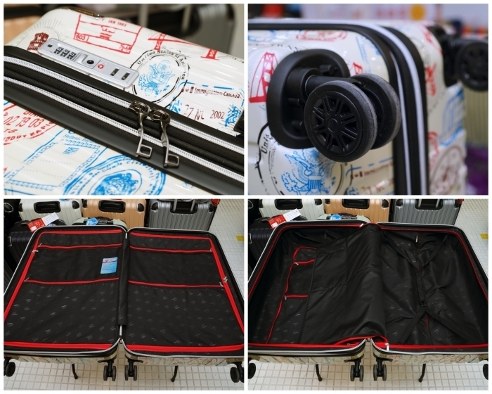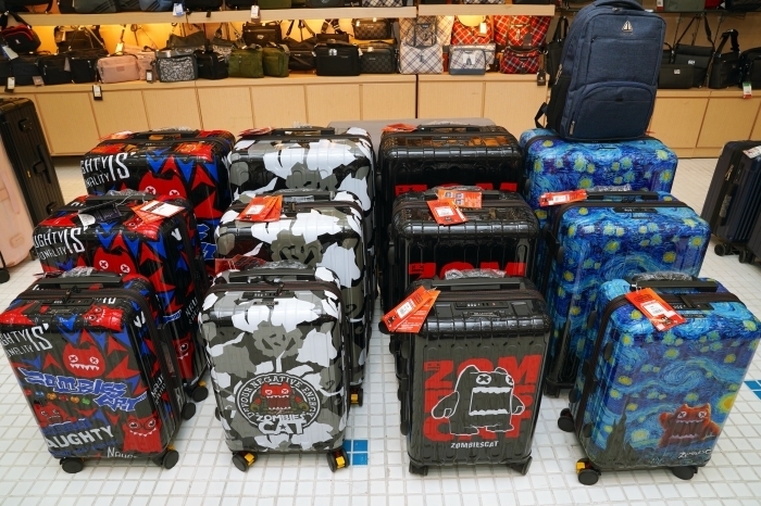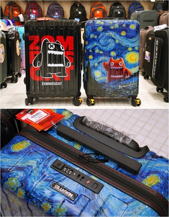 彩繪行李箱區是美洲豹行李箱。有些人買素面行李箱用久了都會貼滿貼紙,這種彩繪行李箱直接仿行李箱貼貼紙的樣式,蓋滿郵戳。