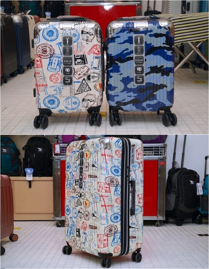 | 郵戳款、迷彩款行李箱都是ABS+PC材質、鋁合金拉桿的設計,配置TSA海關鎖、專利萬向減震輪 ,均可擴充使用。 |