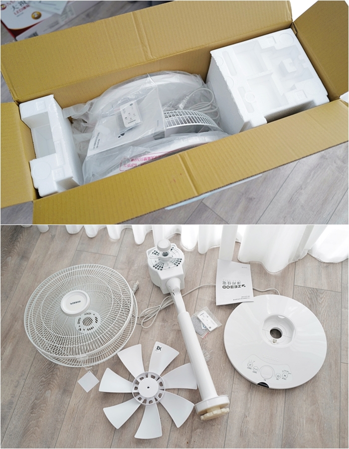 | 打開箱子後把全部的零件拿出來,組裝非常簡單,連女孩子也可以輕鬆組裝上手,基本上就跟一般拆開電風扇清潔沒有什麼兩樣,多了一步將中柱放到底盤裡面。 |