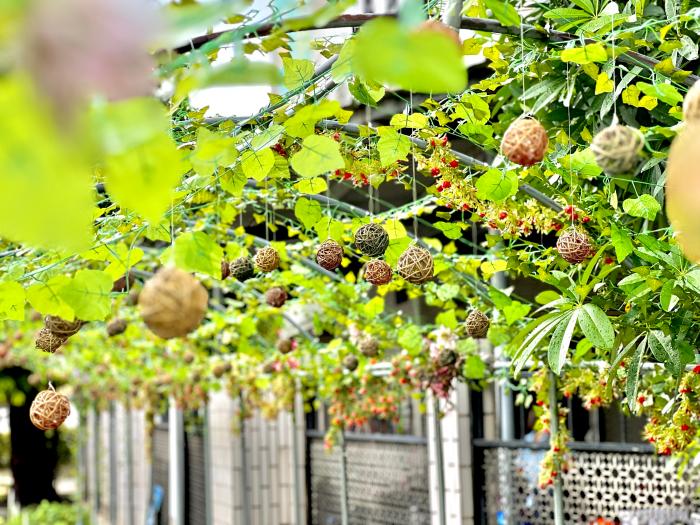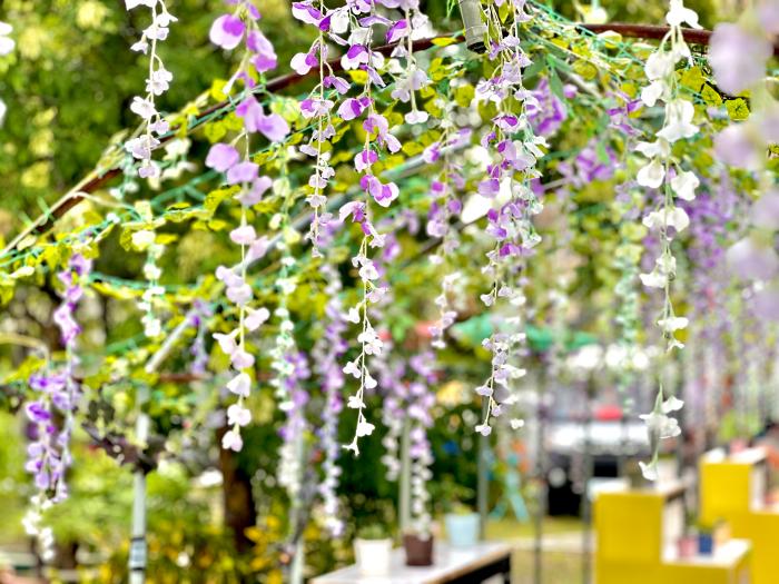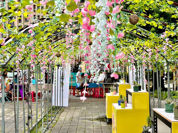 | 戶外還規劃了夢幻紫藤花棚架,還有園藝班作品多肉植物可欣賞。 |