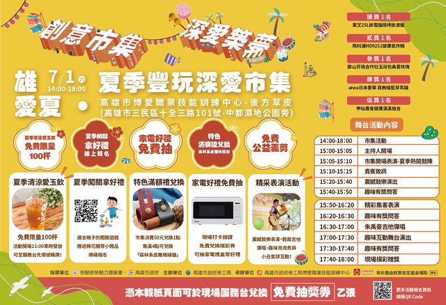 高雄市勞工局於7/1(六)下午在十全三路一博訓中心,舉辦身心障礙學員創意市集活動,整體濃濃夏季日風慶典,不少民眾帶著小孩一同前往,儘管天公不作美,仍不減民眾熱情。