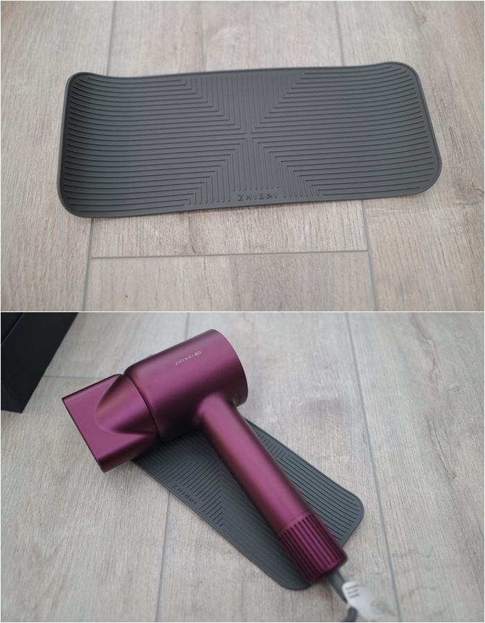 | 除了吹風機主機以外,還有兩個配件,分別是吹風機的套筒以外還有一個墊子。 |