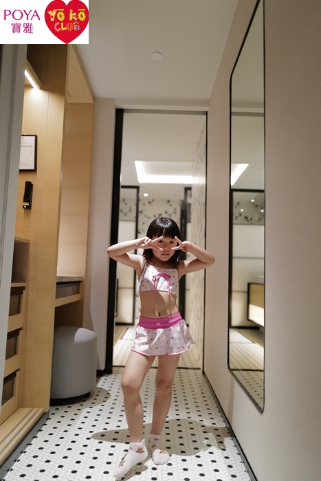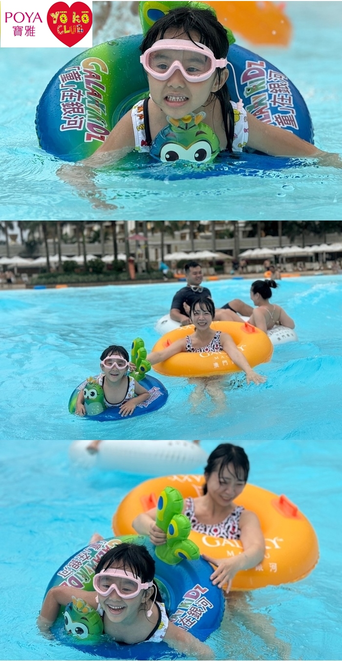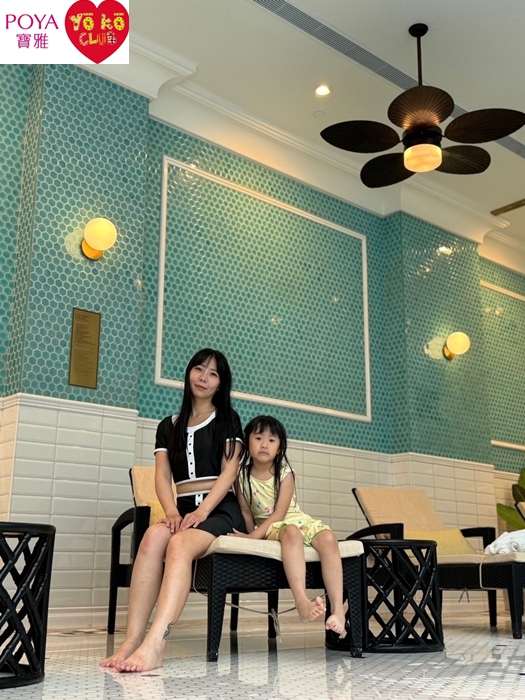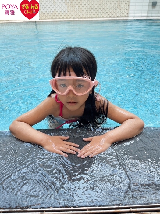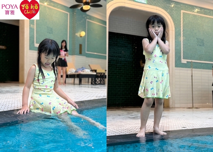 | 隔天前往葡京人的室內泳池玩水又拿了不一樣的泳衣來替換,因為是室內泳池,所以母女倆就挑了較彈性塑身布料的泳衣來穿,太妃同樣是兩件式泳衣,上衣則是細肩帶荷葉邊,穿起來很是可愛。 |