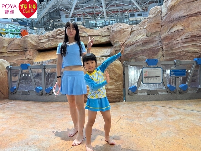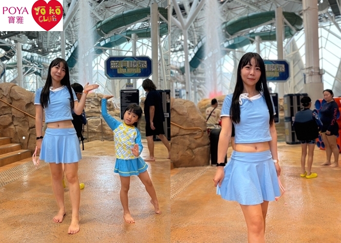 | 因為室內陽光較弱,也沒有太刺激的水上設施,所以女兒就換上最可愛的兩截式泳裝。 |