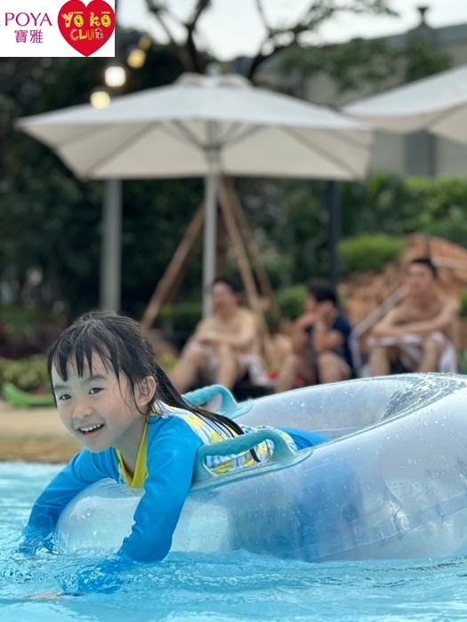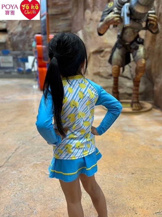 | 女兒的泳裝我也超喜歡,因為新濠天地的水上樂園有一半都在室外,當天是個大太陽天,長袖防曬布料可以有效阻擋炙熱的太陽曝曬,同樣搭配可愛裙裝超有活力。 |